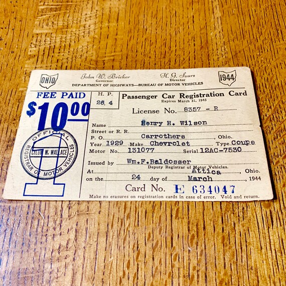 1929 Chevrolet Coupe 1944 Ohio Car Registration Card