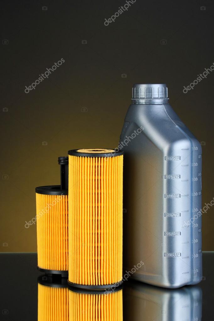Car Oil Filters And Motor Oil Can On Dark Color Background