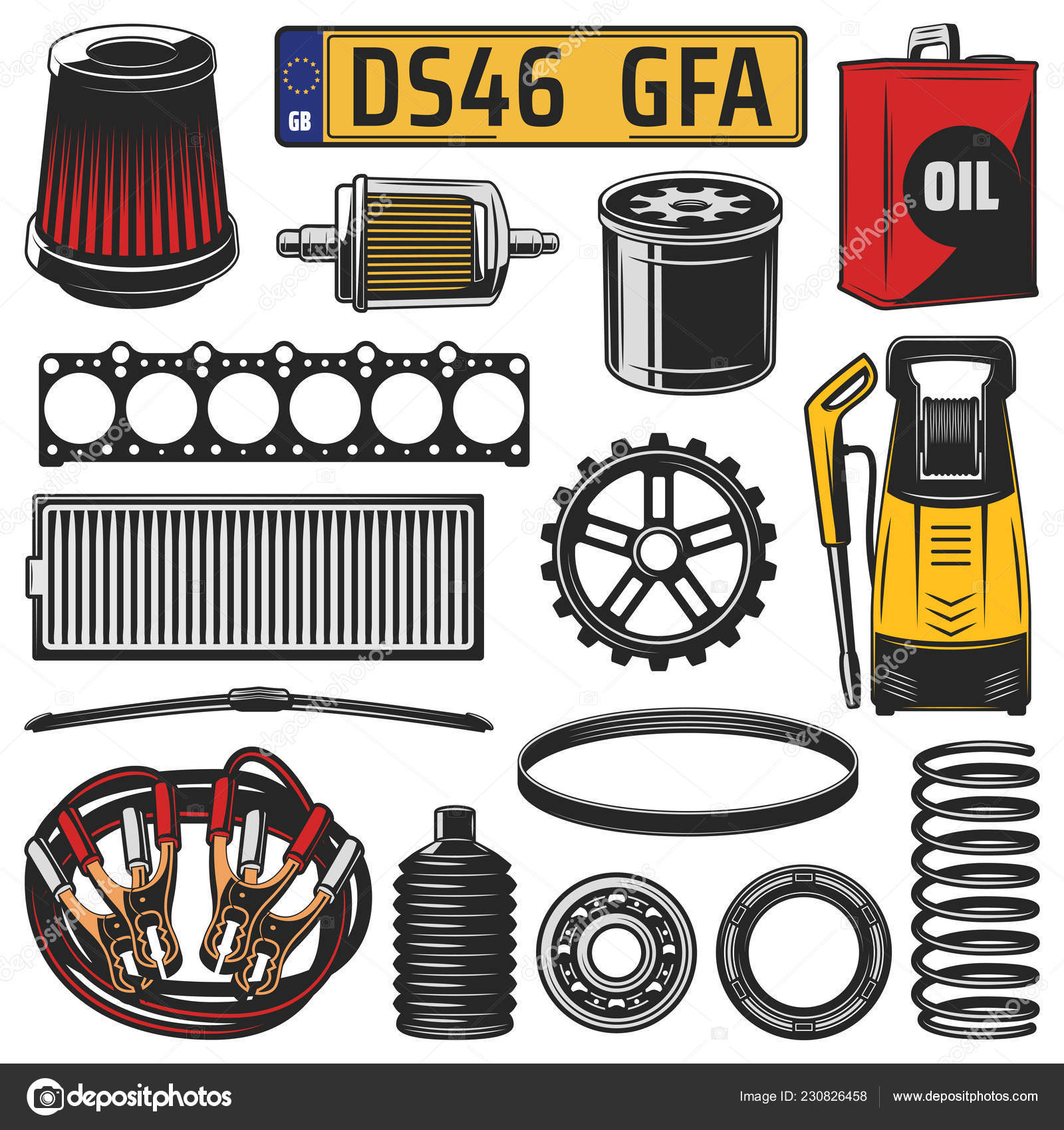 Car Spare Parts Engine Details And Motor Oil Stock Vector