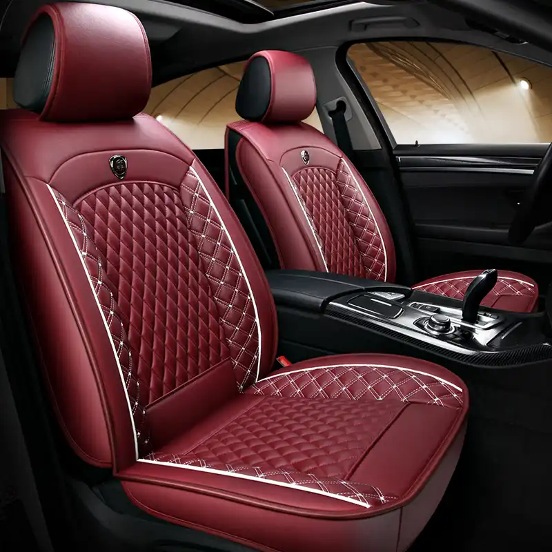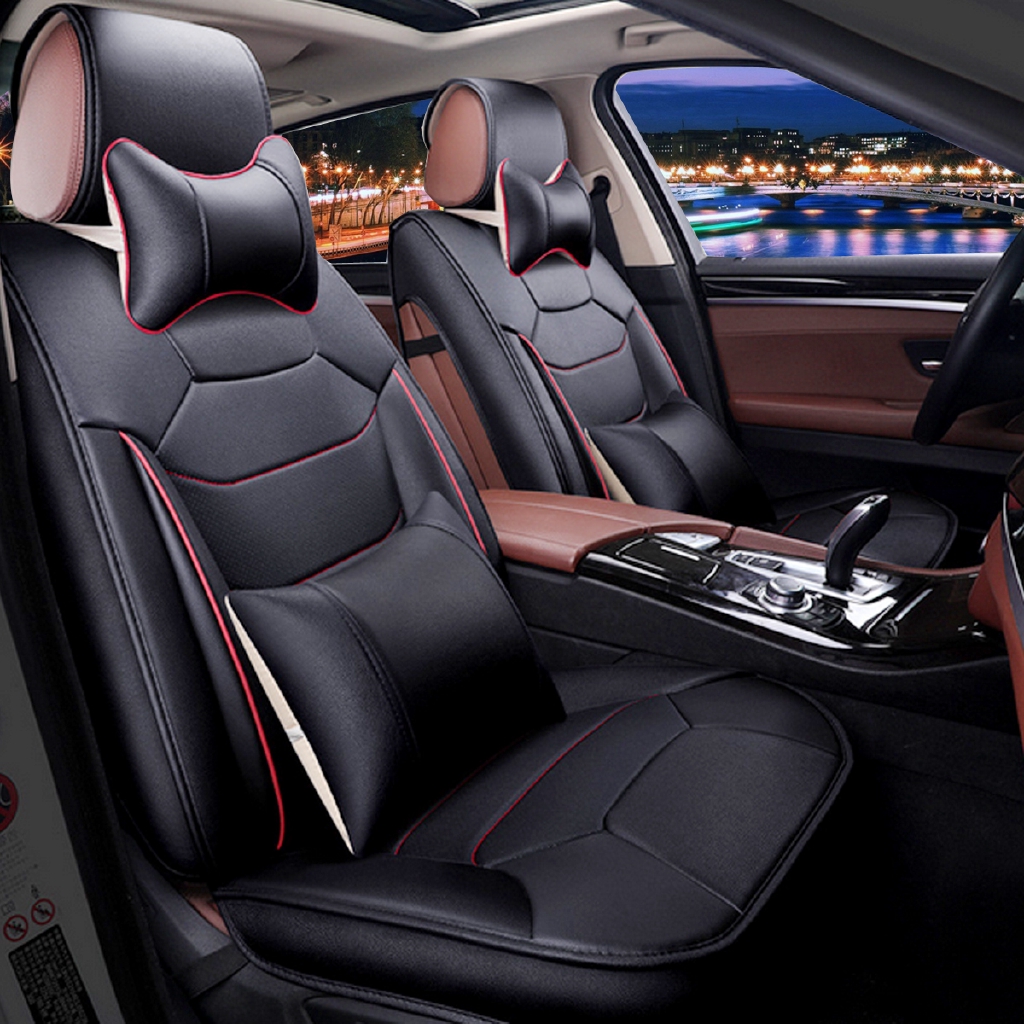 Premium pu leather seat covers add all the class and luxury of leather to your car without the price or the upkeep. Car seat cover full set needlework pu leather black red for 5 seat car. Our seat covers are made of the highest quality faux leather and treated with a protective coating for durability compatibility and buying tips this product is compatible with removable headrests only.