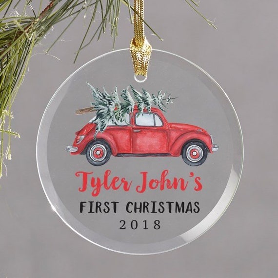 Personalized First Christmas New Baby Ornament Vintage Red Car Truck Round Glass Ornament Personalized With Name And Year