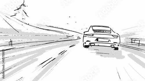 Drawing Of A Person Driving A Car On A Winding Road Stock