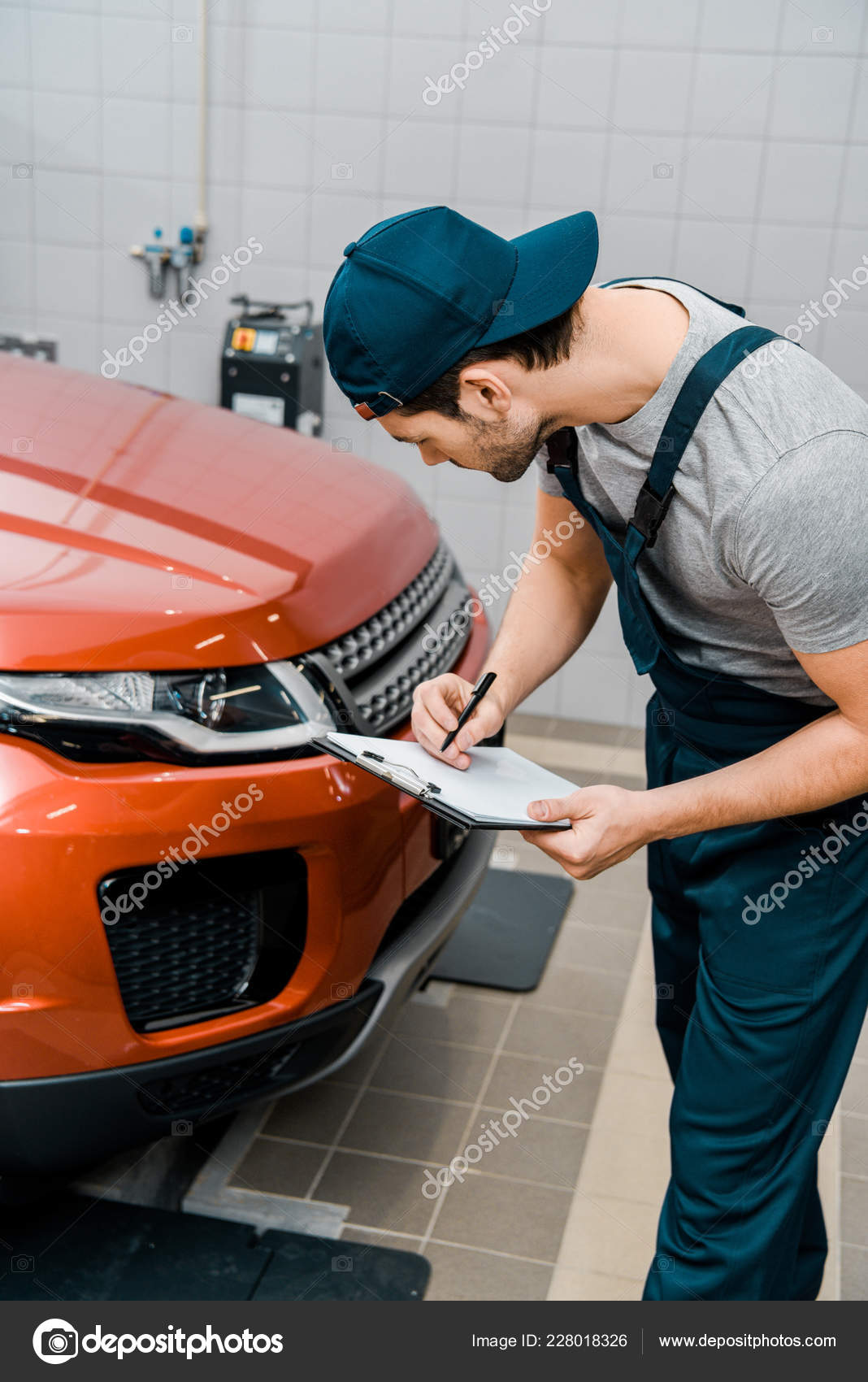 Young Auto Mechanic Uniform Notepad Examining Car Auto