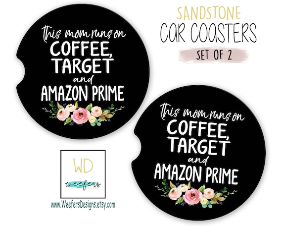 This Mom Runs On Coffee Target And Amazon Prime Car Coasters Funny Mom Car Cup Holder Gift Gift For New Mom Baby Shower Gift Car0061