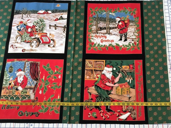 Old Fashioned Victorian Santa Christmas Scenes Fabric Pillow Quilt Panels Squares Toy Workshop Antique Car Steam Engine Train Metallic