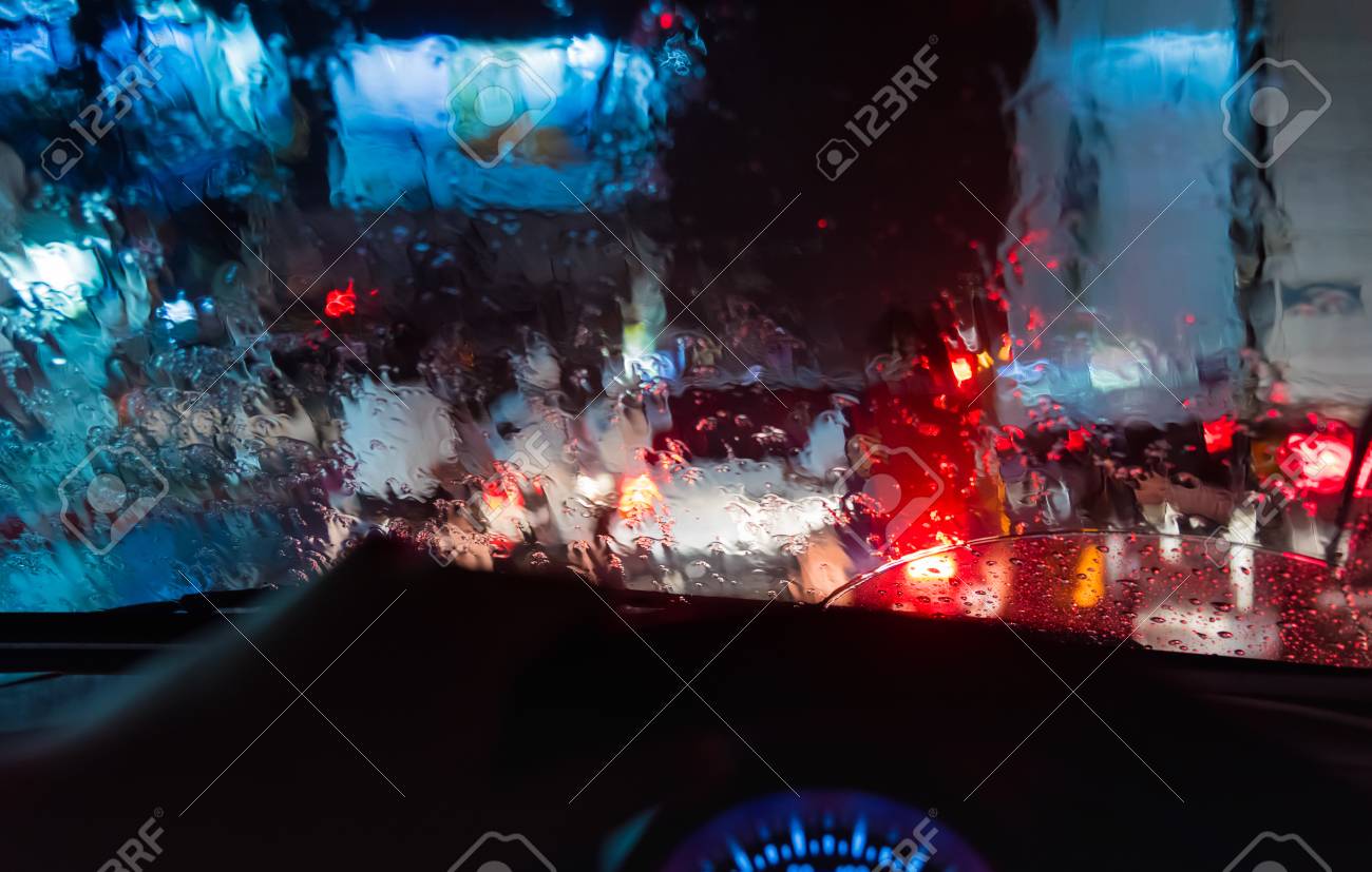 Inside Car With Bokeh Lights From Traffic Jam On Night Time