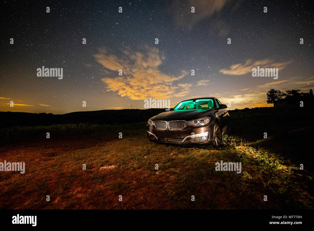 Car Interior Shifting Changing Gear Stick In Manual Car Close Up Night Time With Street Lights