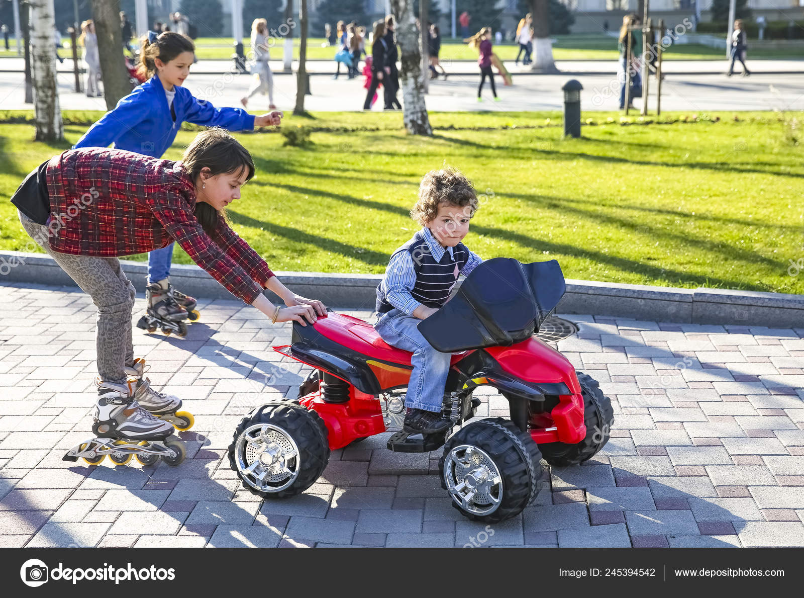 Kids Driving Electric Toy Car In Summer Park Outdoor Toys