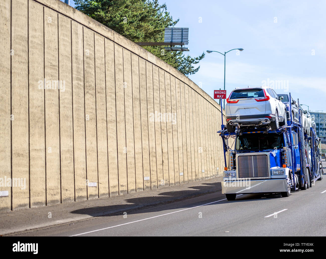Bright Blue Big Rig Car Hauler Semi Truck Transporting Cars