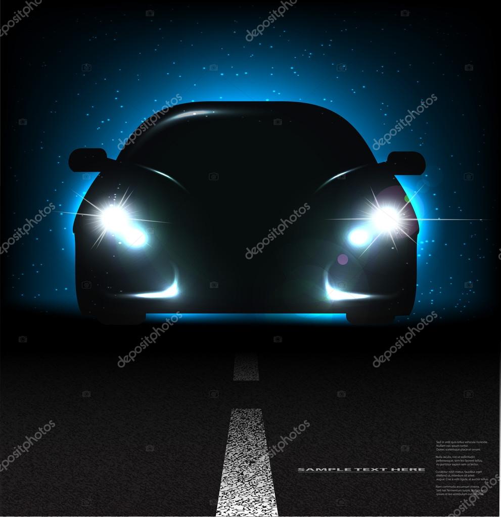 Silhouette Of Car With Headlights On Asphalt Dark Background