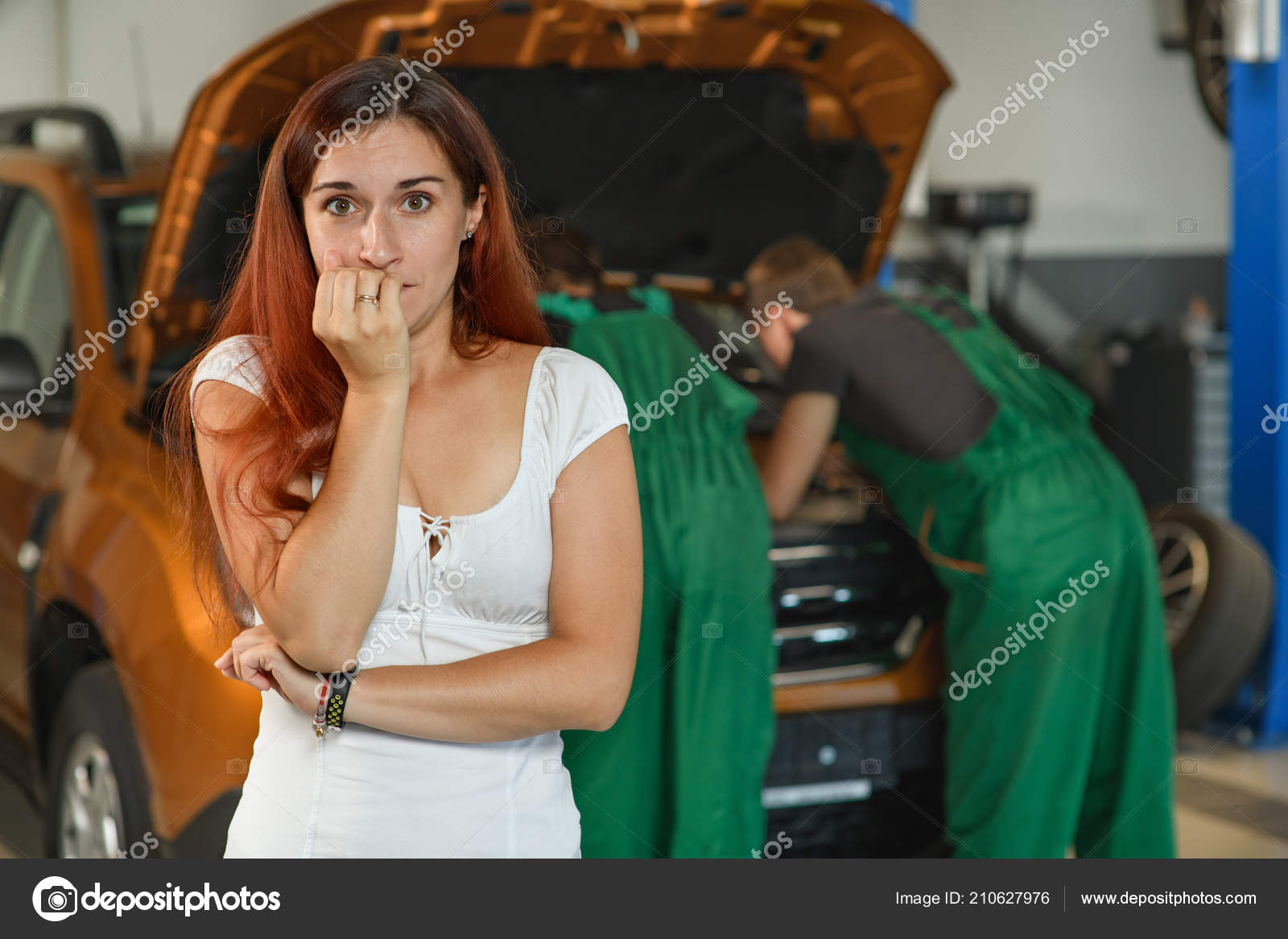 Beautiful Girl Poses Photo While Two Young Mechanics Green