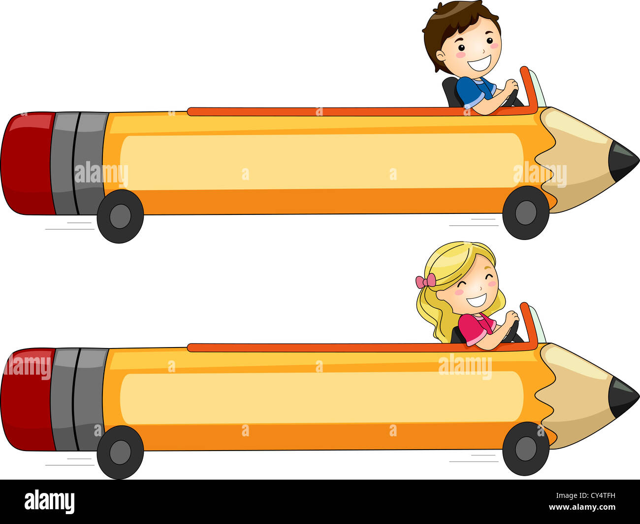 Banner Illustration Featuring Kids Driving A Pencil Shaped