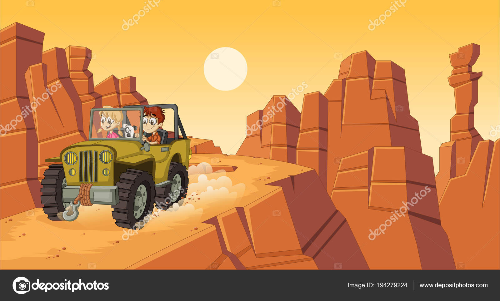 Cartoon Children Driving Car Canyons Road Adventure Stock