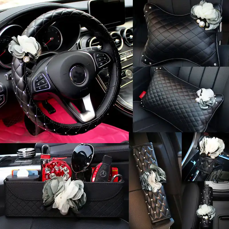 Flower Car Interior Decoration Accessories For Girls Ladies Women Crystal Seat Belt Cover Diamond Leather Steering Wheel Cover Tissue Box