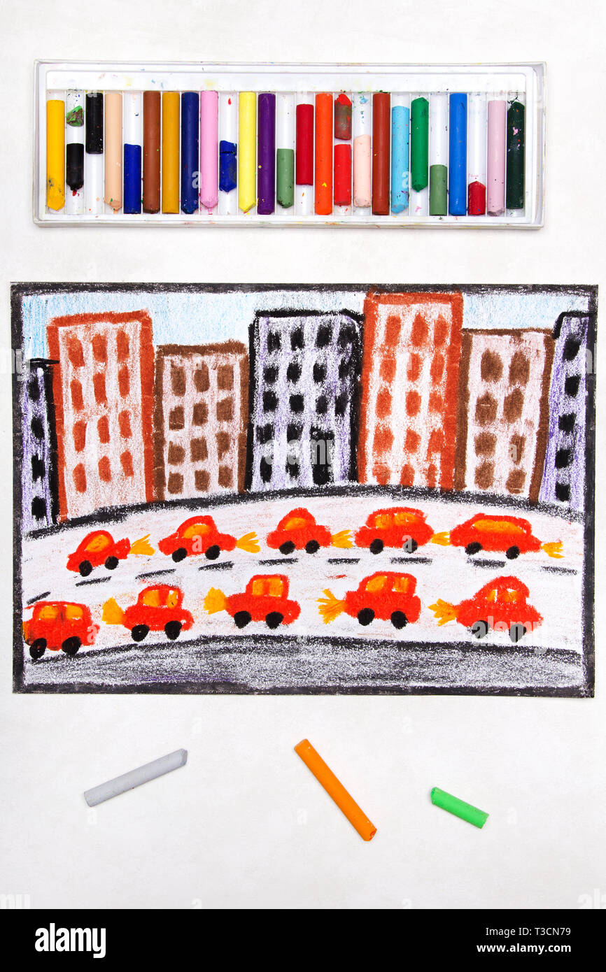 Colorful Drawing Big City And Highway Cars Next To Blocks