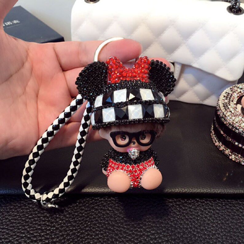Rhinestone Monchhichi Keychains Leather Lanyards Mickey Bow Hat Monchichi With Cute Eye Frame Women Auto Car Key Ring