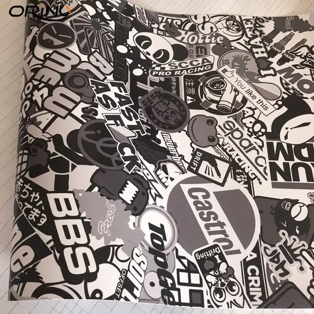 Black White Stickerbomb Vinyl Wrap Graffiti Cartoon Jdm Printed Decorative Adhesive Film Sheet For Racing Car Motocycle Bike